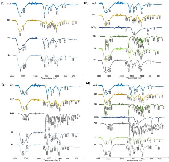 FTIR–ATR spectra of ALG, PEC, CaCO3, POS, formulations without drugs (P1, P2, P4, P5) and formulations containing POS (F1, F2, F4, F5) are presented in Figure 14. There were a wide band of O-H bonds stretching vibrations with a maximum at 3257 cm−1, and a signal from C-H bonds stretching vibrations at 2929 cm−1 observed in the ALG spectrum. Furthermore, a band of asymmetric vibrations (1599 cm−1), and a band of symmetric vibrations (1406 cm−1) originating from carboxylic salt were present. The stretching vibrations of C-O bonds present in the pyranose ring (1025 cm−1) were also noted. Spectra of the physical mixtures were dominated by signals originating from ALG, PEC and GDL. In the spectra of formulations containing PEC (formulation placebos P4, P5 and POS-loaded formulations F4, F5), signals at 1665 cm−1, which represent amide bond vibrations, were presented. In the crosslinked formulations, GDL signals were noted. GDL bands that originated from C=O bonds vibrations were observed at 1735 cm−1—characteristic of lactone. However, signals coming from the vibrations of CaCO3 bonds were not visible. This fact might be related with the low concentration of CaCO3 in drug formulation. The FTIR–ATR spectra of substances in low concentrations might not be detectable—the method will show the signals of components that are present in the formulation at a level of at least 1% [75]. Furthermore, in spectra representing POS-loaded formulations (F1, F2, F4, F5), gentle signals characteristic of bond vibrations presented in POS were observed, as well as characteristic C=O vibration signals from the urea functional group at round 1680 cm−1, aromatic ring stretch (1509 cm−1), C-N bonds stretch (1349 cm−1), C-O aryl-alkyl ether vibrations (1232 cm−1), C-F stretching vibrations (1093 cm−1) and aromatic ring out of plane bend (867 cm−1). The presence of these characteristic signals indicates good compatibility of a drug with excipients.