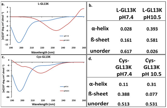 CD analysis of L−GL13K and Cys−GL13K. (a) The CD spectra and (b) the peptide structural components of L−GL13K. L−GL13K exhibited a molecular structure dominated by random coil at pH 7.4 and transformed to α−helix and β−sheet structures at pH 10.5. (c) The CD spectra and (d) peptide structural components of Cys−GL13K. Cys−GL13K also exhibited a molecular structure dominated by random coil at pH 7.4, but unlike L−GL13K, it mainly transformed into α−helix structures at pH 10.5.