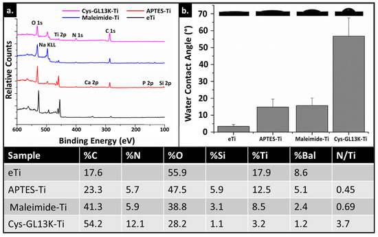 Surface characterization of modified Ti surfaces. (a) XPS survey spectra of modified Ti surfaces. Spectra of Cys−GL13K−coated Ti exhibited increase in N 1 and C 1s signals and decrease in Ti signal, compared to uncoated eTi surfaces. (b) Water contact angles of modified Ti surfaces with images of the dispensed sessile drops on the different substrates. Data shown are the average ± standard deviation of n = 3–6 replicates. Table shows XPS atomic % concentration (at % ratio) for the same surfaces tested in (a).
