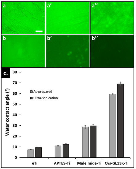 Durability after ultrasonication of Cys−GL13K coatings. Fluorescent micrographs of covalently anchored (top row) and physiosorbed (bottom row) Cys−GL13K onto titanium surface: (a,b) as−prepared, (a’,b’) sonication cycle of 5 min, and (a’’,b’’) sonication cycle of 30 min. The bio−conjugated peptide showed strong resistance to sonication, whereas physiosorbed coating desorbed after 30 min of sonication. (c) Changes in the water contact angle of covalently anchored Cys−GL13K peptides and control surfaces post sonication cycle of 30 min.