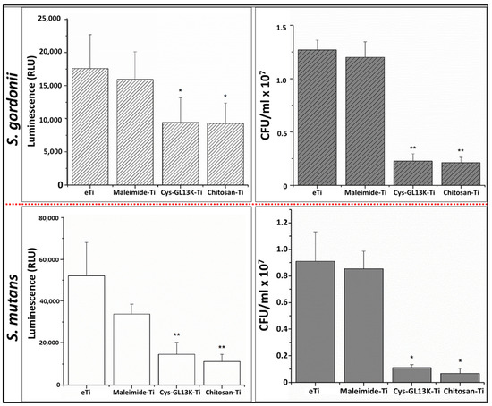 Antibacterial activity of cys−GL13K−coated and control titanium surfaces against S. gordonii (top) and S. mutans (bottom) biofilms. Vitality of bacteria was assessed by ATP bioluminescence (left graphs), as a measure of metabolic activity, and bacteria viability was assessed by counting colony forming units (CFUs; right graphs). Significant differences between groups are marked * (p−value < 0.05) and ** (p−value < 0.01).