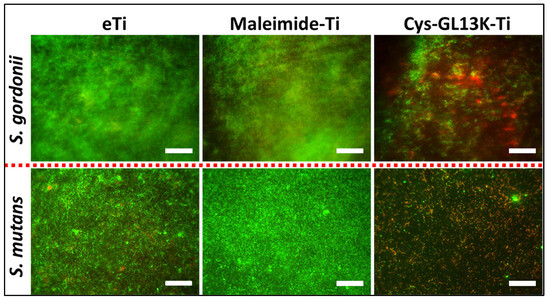 Streptococcus species play important roles in biofilm formation and the pathogenesis of tissues of the oral cavity [66]. S. mutans has been described as a common pathogenic species present in biofilms leading to dental decay. S. gordonii is a primary colonizer on oral surfaces that provides attachment for the subsequent pathogenic biofilm formation by Porphyromonas gingivalis [67], implicated in periodontal and peri−implant infections [67]. Cys−GL13K coatings displayed a significant reduction in the viability (CFUs) and vitality (ATP bioluminescence) of both S. mutans and S. gordonii biofilms compared to non−coated eTi and maleimide−coated Ti control surfaces (Figure 5). The LIVE/DEAD fluorescent imaging test (Figure 6) confirmed that cys−GL13K coatings on titanium had strong antimicrobial effects with dominant fluorescent red bacteria, indicating that these bacteria had compromised membranes. However, biofilms on eTi and maleimide−coated titanium had dominant fluorescent green viable bacteria with intact membranes. Taken together, these results supported the conclusion that the chemoselective immobilization of L−GL13K peptides on Ti surfaces using N−terminus single−cystine addition resulted in potent antimicrobial coatings against relevant bacteria strains in the oral cavity. The release of Cys−GL13K peptide from the surfaces cannot be fully discarded and further work will include an investigation of the efficacy of these coatings in environments that more closely simulate oral challenges, such as those posed by multispecies or microcosm biofilms and/or under dynamic media flows in CDC or drip flow bioreactors.