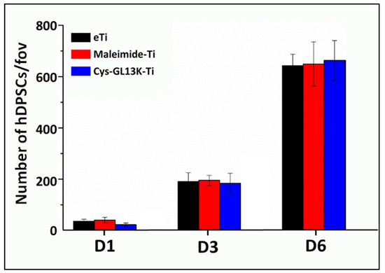 Cytocompatibility with hPDSCs of cys−GL13K−coated and control titanium surfaces. D1, D3, and D6: day 1, day 3, and day 6 of hDPSCs culture, respectively. fov: field of view.