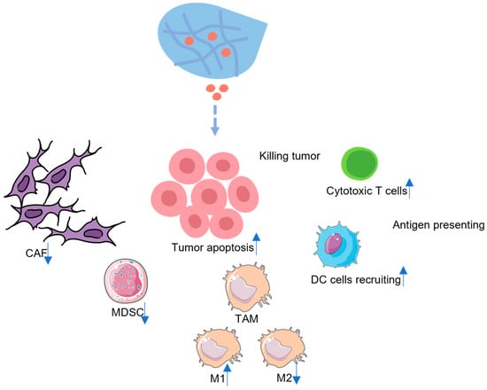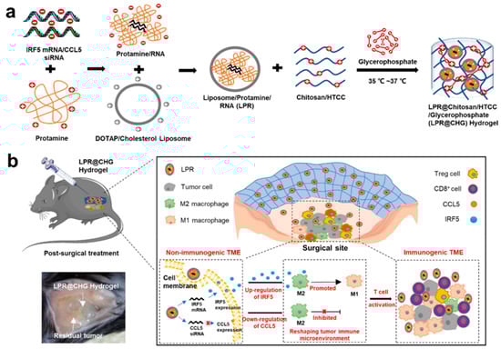 Immunomodulatory factor 5 (IRF5) has been reported to promote the polarization of M2 TAMs into M1 phenotype in the TME. Conversely, CCL5 has been implicated in tumor progression through its involvement in TAM recruitment. Gao, C et al. exploited an injectable thermosensitive chitosan hydrogel to deliver IRF5 mRNA and CCL5 siRNA directly into PDAC TME. They employed protamine, a natural cationic protein, to form complexes with negatively charged RNA molecules, protecting mRNA from degradation by serum RNases. To enhance delivery efficiency, the protamine/RNA complex was further encapsulated with liposomes composed of 1,2-Dioleoyl-3-trimethylammonium-propane (DOTAP) and cholesterol. This RNA-loaded liposome system was then combined with chitosan to create the hydrogel precursor. Upon injection into mice, the hydrogel precursor was crosslinked at physiological temperature, forming a gel-like substance. Over time, the hydrogel gradually degraded within the body, leading to the release of the nanoparticles into the TME, thus facilitating RNA delivery to tumor cells and exerting a therapeutic role. Remarkably, within 16 days of implantation, more than 90% of liposomes were released from the hydrogel. This innovative hydrogel system effectively induced the polarization of M2 macrophages to the M1 phenotype and increased the infiltration of CD8+ T cells into the TME. Consequently, this approach holds great promise for preventing the recurrence and metastasis of PDAC following surgical intervention (Figure 6) [127].