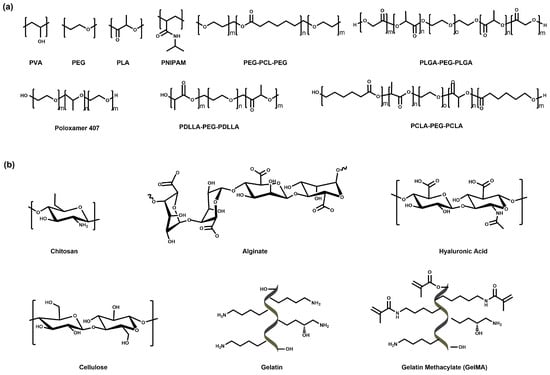 Hydrogels are three-dimensional networks of hydrophilic polymers and are promising candidates for drug delivery due to their unique properties. In recent years, the involvement of hydrogels in PDAC treatment has gained attention due to their potential therapeutic benefits [70,71]. Based on the type of monomers, hydrogels applied for PDAC treatment can be classified into three categories, including synthetic hydrogels, natural hydrogels, and semi-synthetic hydrogels. Synthetic hydrogels are composed of synthetic polymers such as polyethylene glycol (PEG) [72], polyacrylic acid (PAA) [73], polyvinyl alcohol (PVA) [74], and polylactic acid (PLA) (Figure 3a) [75], which are tunable, reproducible, and stable; however, they might be limited by their poor biocompatibility and biodegradability [76]. Meanwhile, natural hydrogels comprise biomaterials derived from animal or plant tissues, such as proteins [77], polypeptides [78,79,80,81], polysaccharides [82], and nucleic acids [83]. The most commonly employed proteins in hydrogel include gelatin [84], collagen [85], and fibrin [86], while widely used polysaccharide polymers include alginate [87], chitosan [88], hyaluronic acid [89], and cellulose [90] (Figure 3b). Natural hydrogels are biocompatible and allow for minimal adverse reactions or immunogenic responses upon implantation or injection [91]. Moreover, natural hydrogels are also biodegradable and can be cleared from the body over time, reducing the risk of long-term complications [91]. Gelatin hydrogels have been widely used as drug-delivery systems for PDAC treatment. They undergo enzymatic degradation by proteolytic enzymes present in the body, allowing for their controlled biodegradation over time [92]. Currently, several natural polymers have been approved by the FDA for in vivo applications [93,94]. In addition, semi-synthetic hydrogels are composed of both natural and synthetic polymers, providing a combination of biocompatibility and controllability [95].