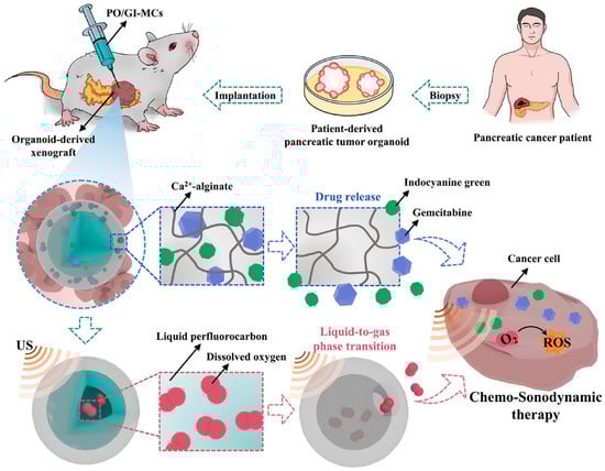 The poor outcome of traditional therapy including chemotherapy and radiotherapy in advanced PDAC has provided opportunities for combined therapy, and hydrogels can exist as an appropriate platform to deliver drugs of different types to the tumor tissue [121]. In recent years, acoustic dynamic therapy (SDT) has been rapidly developed as an emerging noninvasive treatment for cancer. SDT eradicates tumor cells by generating ROS through the involvement of sonosensitizers and oxygen under ultrasonic radiation. This approach has garnered significant attention due to its ability to penetrate deeply into tissues [122]. However, the hypoxia TME of PDAC poses a challenge to the efficacy of SDT due to the rapid and substantial consumption of oxygen during therapy [123]. To address this issue, Huang et al. utilized microfluidic technology to fabricate a microcomposite hydrogel comprising an alginate shell and a perfluorocarbon (PFC) core. The resulting microgel featured a PFC-based core carrying oxygen and an alginate shell encapsulating GEM and indocyanine green (ICG). Following injecting into cancer-organoid-derived xenograft models, the PFC underwent a phase transition from liquid to gas upon low-density ultrasound stimulation in vitro, leading to the release of oxygen. Simultaneously, the acoustic-sensitive ICG generated a substantial amount of ROS under ultrasound stimulation, which penetrated the tumor tissue along with the GEM release from the alginate hydrogels. Consequently, this strategy for PDAC treatment could reverse the hypoxic microenvironment and induce apoptosis of tumor cells, and resulting in synergistic therapeutic effects compared to the GEM group (Figure 4) [124].