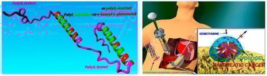 Peptide hydrogels, serving as drug-delivery systems, possess the ability to encapsulate drugs and release them by the modulating their structure and composition. Additionally, they exhibit excellent biocompatibility and can be easily synthesized [141]. Moreover, peptide hydrogels display various responsiveness, allowing for precise regulation of drug release in response to external environmental factors [142]. Bilalis et al. developed a hydrogel for PDAC treatment by combining a unique pentablock terpolypeptide (PLys-b-(PHIS-co-PBLG)-PLys-b-(PHIS-co-PBLG)-b-PLys) with GEM in a syringe. The hydrogel was designed to specifically deliver the drug to cancerous tissue while minimizing the harm inflicted upon healthy tissue. The distinctive macromolecular architecture of the polypeptide facilitated spontaneous gelation of the solution upon injection into the tumor tissue without the need for external stimulation. Simultaneously, the polypeptide hydrogel underwent degradation in response to the acidic pH and protease levels within the TME of PDAC, thereby resulting in the gradual release of GEM and effectively inducing apoptosis of PDAC cells (Figure 5) [18].