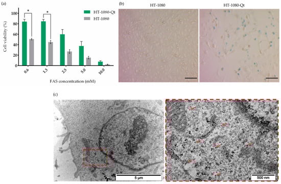 Taking into account that the formation of iron-containing nanoparticles in HT1080-Qt cells requires preliminary incubation with FAS for 24 h, we carried out an assessment of the viability of HT1080-Qt cells in the presence of FAS at various concentrations (from 0.6 to 10 mM), where HT1080 cells were used as a control. From the histogram presented in Figure 1a, it is clearly seen that HT1080 cells are sensitive to the extra iron in the growth medium, and in the presence of FAS, a dose-dependent decrease in cell viability is observed. However, the viability of HT1080-Qt cells at the same concentrations of FAS is higher—statistically significant differences (p < 0.05) are observed at concentrations of 0.6 mM and 1.3 mM. Thus, based on the viability assay results, we chose a FAS concentration of 1 mM for all further studies. Next, Prussian blue staining was performed in order to qualitatively assess the accumulation of iron in HT1080-Qt cells after incubation with FAS (Figure 1b). The resulting micrographs of HT1080-Qt cells show a characteristic blue color with cytoplasmic localization, indicating the accumulation of iron deposits. In control HT1080 cells, no coloration was observed. The formation of iron-containing nanoparticles in Qt encapsulins was also detected by TEM (Figure 1c). The micrograph clearly shows multiple electron-dense nanostructures diffusely located in the cytoplasm of the cell.
