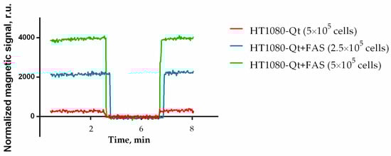 The magnetic signals of the control (HT1080-Qt cells) and two samples with different concentrations of cells preincubated with FAS measured using the MPQ method. Initial and final signal levels: samples are inside the coils; intermediate level—samples are outside the MPQ coils.