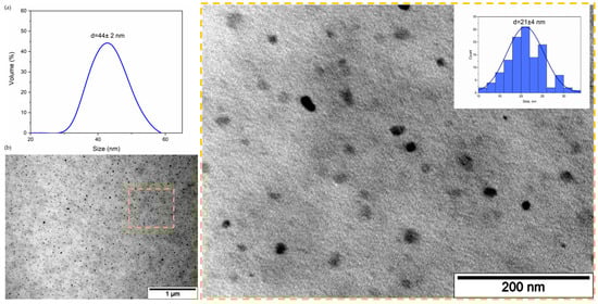 Next, Qt encapsulins were purified from HT1080-Qt cells by the immunoprecipitation method using anti-Flag affinity gel for isolation. The hydrodynamic size of Qt encapsulins was determined by dynamic light scattering (DLS). Figure 3a shows an example of the size distribution of Qt encapsulins, where the average diameter of isolated Qt nanocompartments was 44 ± 2 nm. The isolated encapsulins were also visualized by TEM (Figure 3b), and the average size of iron-containing nanoparticles formed inside the shells was measured, and a narrow size distribution was observed (21 ± 4 nm). The hydrodynamic size of the isolated encapsulins, as well as the average size of iron-containing nanoparticles formed inside the shells of encapsulins, established in our study, are in good agreement with the literature data [34].