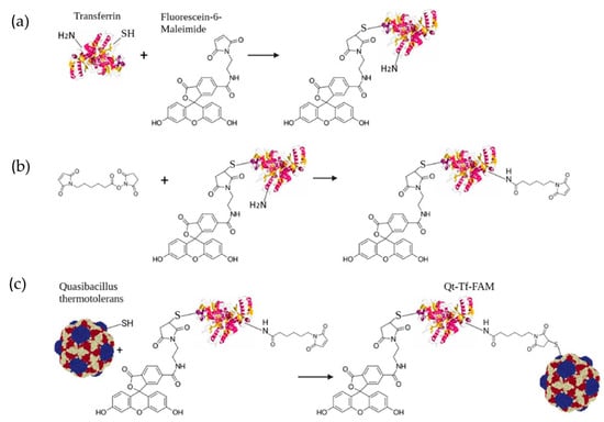 Reaction schemes for the preparation of Tf-FAM-labeled Qt encapsulins. (a) Transferrin conjugation with FAM; (b) Tf-FAM reaction with the EMCS linker; (c) Tf-FAM conjugation with Qt encapsulin shells via EMCS linker.
