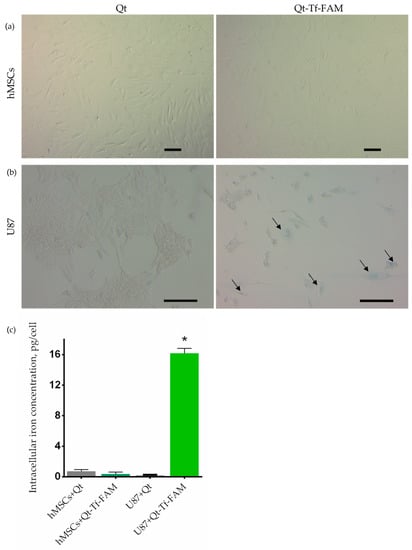 At last, a comparative analysis of the uptake of iron-containing Qt and Qt-Tf-FAM encapsulins by U87 cells and hMSCs was carried out by qualitative and quantitative assessment of iron accumulation via Prussian blue staining and AES, respectively. As can be seen from the micrographs presented in Figure 5a, no coloration was registered after the incubation of hMSCs with Qt and Qt-Tf-FAM. In contrast, after incubation of U87 cells with Qt-Tf-FAM (Figure 5b), blue inclusions in the cell cytoplasm, indicating the accumulation of iron deposits, are clearly visible. These data are in good agreement with the quantitative results of assessing the accumulation of intracellular iron (Figure 5c) obtained by the AES method (0.2 ± 0.04 pg/cell and 16 ± 0.7 pg/cell after U87 cells incubation with Qt and Qt-Tf-FAM, respectively).