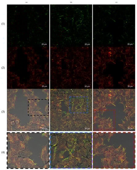 Confocal imaging of U87 glioma cells after (a) 30 min, (b) 90 min, (c) 120 min of incubation with Qt-Tf-FAM. (1) FAM (green fluorescent signal, Ex-Max 498 nm/Em-Max 517 nm), (2) LysoTracker Deep Red dye (red fluorescent signal, Ex-Max 647 nm/Em-Max 668 nm), (3) Merge, (4) Region of interest. Laser scanning confocal microscopy, Zeiss LSM 710 NLO, scale bars are 20 µm.