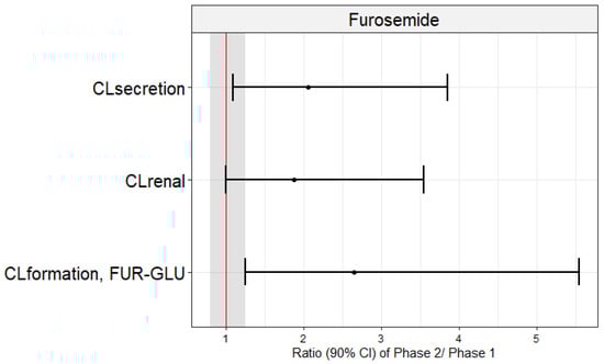 Geometric mean ratios (dots) and confidence intervals of 90% (lines) of furosemide renal (CLrenal) and secretion (CLsecretion) clearances and furosemide glucuronide formation clearances (CLformation, FUR-GLU) in pregnant women in the presence (Phase 1) and absence (Phase 2) of acute pyelonephritis. These mean ratios did not fall within the bioequivalence range (0.80–1.25; shaded area).