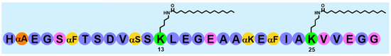 MEDI7219 was prepared by solid-phase peptide synthesis as the C-terminal carboxamide on NovaSyn TGR resin (initial substitution, 0.24 mmol/g). All peptide couplings were performed at ambient temperature for 45 min, using HCTU (O-(1H-6-chlorobenzotriazole-1-yl)-1,1,3,3-tetramethyluronium hexafluorophosphate)–diisopropylethylamine (DIPEA) in N-methylpyrrolidone (NMP)– dimethylformamide (DMF). Residues immediately following incorporation of α-methyl analogues were always coupled twice to ensure full incorporation. Following acylation, capping of residual functionality was performed over 10 min using a solution of acetic anhydride and pyridine in DMF. The fluorenylmethoxycarbonyl (Fmoc)-protecting group was deblocked by using piperidine in DMF (20% v/v) at ambient temperature for 2 × 10 min each. The N-terminal histidine was incorporated as the Boc-His(Trt)-OH to simplify cleavage. Fmoc-L-Lys(Mmt)-OH was incorporated into positions 13 and 25 (Tyr19 and Trp31 in hGLP-1 7-36, respectively) to allow for side-chain functionalization. Upon complete assembly of the peptide, the Mmt-protecting groups were selectively removed by manual treatment of the resin with 1% trifluoroacetic acid and 2% triisopropyl silane (TIPS) in dichloromethane (10 × 1 min, 20.0 mL/g). The acidified resin was quenched with 5% DIPEA-NMP, and the exposed lysine ε-amino functions were functionalized manually prior to peptide cleavage. The crude peptide was liberated from the resin by treatment with a cocktail consisting of trifluoroacetic acid (95% v/v), TIPS (2.5% v/v), and water (2.5% v/v) with agitation (3 × 1 h at ambient temperature). Purification of the crude bis-lipidated peptide was performed by dissolving the crude peptide in 0.1 M ammonium bicarbonate solution (1:5 acetonitrile/water, v/v; pH 8.0), which was filtered prior to sample loading (30 × 250 mm X-Bridge C18 Beh column; Waters, Milford, MA, USA). Purified peptides were characterized by liquid chromatography–mass spectrometry, using a Mass Lynx 3100 platform (Waters, Milford, MA, USA) eluting over an X-Bridge C18 Beh column (Waters), with detection by both ultraviolet absorption at 210 nm and electrospray ionization using a 3100 mass detector (Waters, Milford, MA, USA).