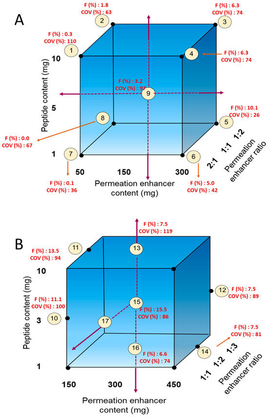The second level of optimization (Figure 2B) was based on results obtained from the first optimization. In this second level, we tested a peptide content of 3 mg (in addition to 1 and 10 mg), increased the permeation enhancer content to 450 mg, and also tried a permeation enhancer ratio of 1:3.