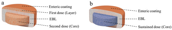 Schematic diagram of different layers of tablet. (a) OralogiK Formulation 1; (b) OralogiK Formulation 2.