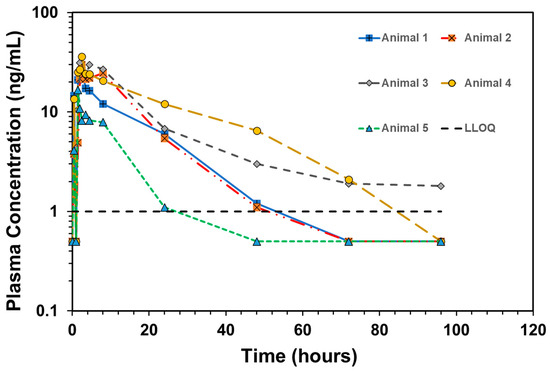 Plasma concentration–time profiles of individual animals dosed with Formulation 5. Formulation 5 = 1 ng/mL is shown as a red dashed line. All values below LLOQ were plotted as ½ LLOQ for illustration purposes.