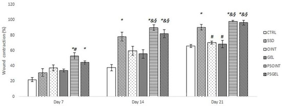 Influence of applied formulations on the wound contraction in diabetic rats. Values are mean ± standard deviation. * p < 0.05 compared to CTRL group; # p < 0.05 compared to SSD group; & p < 0.05 compared to OINT group; § p < 0.05 compared to GEL group; CTRL-untreated control group; SSD-1% silver sulfadiazine group; OINT-ointment base group; GEL-gel base group; PSOINT-P.sibirica essential oil ointment group; PSGEL-P. sibirica essential oil gel group.