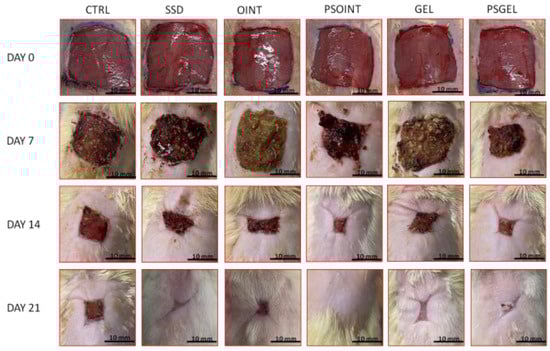 Impact of P. sibirica essential oil-based formulations on wound recovery during three weeks of application on the excision wound model (days: 0, 7, 14, and 21). CTRL-untreated control group; SSD-1% silver sulfadiazine group; OINT-ointment base group; GEL-gel base group; PSOINT-P. sibirica essential oil ointment group; PSGEL-P. sibirica essential oil gel group.