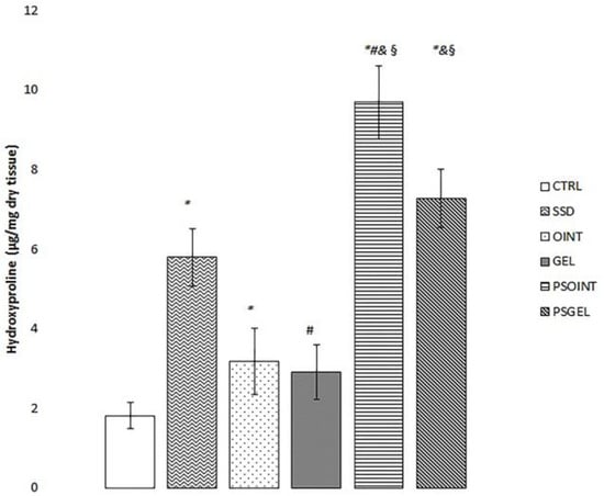 Hydroxyproline content after three weeks of PSEO topical formulations. The results are presented as the mean ± standard deviation. * Statistical significance at p < 0.05 in relation to CTRL group; # statistical significance at p < 0.05 in relation to SSD group; & statistical significance at p < 0.05 in relation to OINT group; § statistical significance at p < 0.05 in relation to GEL group.