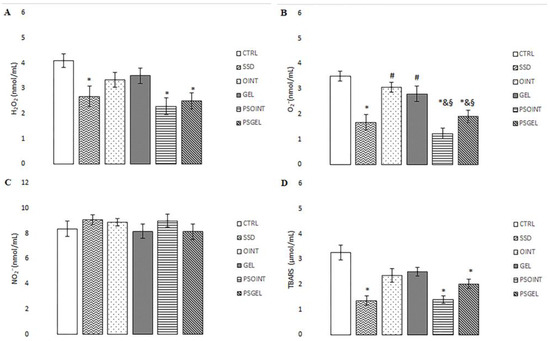 Impact of PSEO formulations on the pro-oxidative markers after three weeks of application: (A) H2O2−; (B) O2−; (C) NO2−; (D) TBARS. The results are presented as the mean ± standard deviation. * Statistical significance at p < 0.05 in relation to CTRL group; # statistical significance at p < 0.05 in relation to SSD group; & statistical significance at p < 0.05 in relation to OINT group; § statistical significance at p < 0.05 in relation to GEL group.