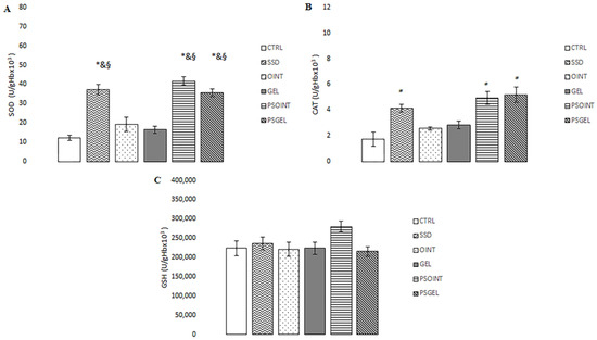 Effect of PSEO formulations after three weeks of application on antioxidative defense system parameters: (A) CAT; (B) SOD; (C) GSH. The results are presented as the mean ± standard deviation. * Statistical significance at p < 0.05 in relation to CTRL group; & statistical significance at p < 0.05 in relation to OINT group; § statistical significance at p < 0.05 in relation to GEL group.