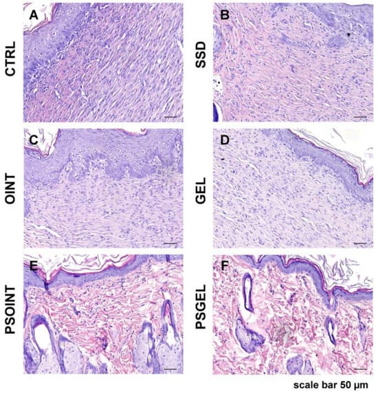 Histological changes in the skin wound section stained with hematoxylin-eosin (H&E). Scale bar, 50 μm. CTRL-untreated control group (A); SSD-1% silver sulfadiazine group (B); OINT-ointment base group (C); GEL-gel base group (D); PSOINT-P. sibrica essential oil ointment group (E); PSGEL-P. sibirica essential oil gel group (F).