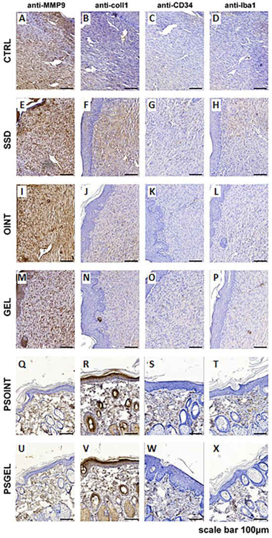 Representative immunohistochemical staining of MMP9, collagen I, CD34, and Iba1 in some animal groups. Scale bar, 100 μm. CTRL-untreated control group (A–D); SSD-1% silver sulfadiazine group (E–H); OINT-ointment base group (I–L); GEL-gel base group (M–P); PSOINT-P. sibrica essential oil ointment group (Q–T); PSGEL-P. sibirica essential oil gel group (U–X).