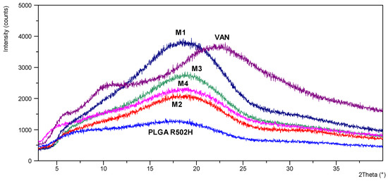 X-ray powder diffraction of pure vancomycin hydrochloride shows that the material is amorphous, as described by Kaduk et al. (2014) [29]. Comparison of the X-ray diffraction patterns of VAN, PLGA polymer and VAN-loaded PLGA microparticles showed no significant differences, indicating that the amorphous nature of vancomycin was not affected by the microencapsulation process (Figure 2).