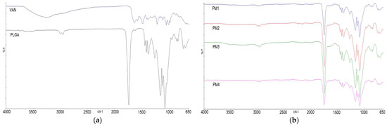 The infrared spectra (IR) were recorded with a PerkinElmer Frontier IR Dual-Range spectrometer (650–4000 cm−1) using the attenuated total reflection (ATR) technique (PerkinElmer, Shelton, CT, USA). Sample analyses were performed using PerkinElmer Spectrum software IR ES version 10.6.0. Infrared spectra of the pure drug (VAN), the pure polymer (PLGA), the prepared microparticles (M1–M4) and the corresponding physical mixtures (PM1–PM4) were recorded.