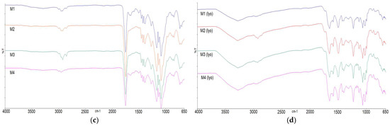 The infrared spectrum of pure VAN (Figure 3a) showed hydroxyl stretching at 3257 cm−1, amide C=O stretching at 1646 cm−1, amide N-H bending at 1586 cm−1, aromatic C=C stretching at 1505 cm−1 and phenolic C-O stretching at 1227 cm−1. The absorption peaks in the range between 1350 cm−1 and 900 cm−1 correspond to C-O and C-N stretching vibrations. The characteristic absorption peaks in the IR spectrum of the pure PLGA polymer (Figure 3a) showed C-H stretching at 2950 cm−1, ester C=O stretching at 1748 cm−1, C-H bending in the range of 1460–1300 cm−1 and C-O stretching in the range of 1300 to 1000 cm−1 [23]. The FT-IR spectra of the physical mixtures (PM1–PM4) (Figure 3b) and PLGA microparticles loaded with VAN (M1–M4) (Figure 3c) contain mostly visible peaks of the polymer. Absorption peaks attributed to the presence of VAN in M1–M4 microparticles were barely visible in the range 1650–1500 (C=O stretching of the amide and N-H bending), similar to the four formulations. Other peaks characteristic of VAN were not visible, as they overlapped with the strong absorption peak of the C-O stretching of the polymer. To better elucidate the structure of the encapsulated drug, VAN was extracted from the microparticles in the aqueous medium and freeze-dried. The infrared spectra of the prepared samples (M1–M4 lyo) (Figure 3d) show absorption peaks characteristic of VAN, since the polymer has been removed by extraction. There are slight differences between the four formulations.