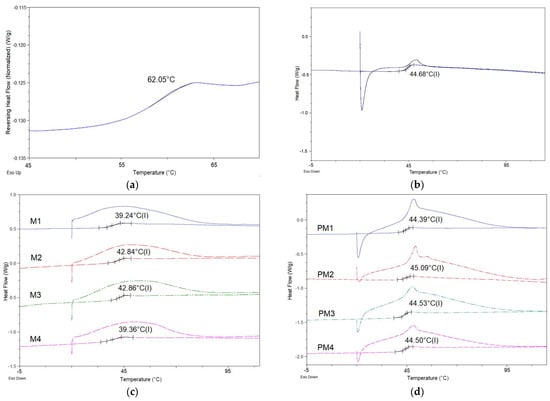 DSC studies were performed on the following samples: pure polymer and VAN (Figure 4a), VAN-loaded PLGA microparticles M1–M4 (Figure 4b) and their corresponding physical mixtures containing the same substances as the microparticle formulations (Figure 4c). The baseline shift in the thermogram of the pure VAN compound with a midpoint at 62 °C (Figure 4a) corresponds to a phase transition, which is characteristic of the amorphous drug [30]. Resomer 502H has a Tg value of 44.68 °C. In the DSC thermograms of the microparticles loaded with VAN (Figure 4c) and their physical mixtures (Figure 4d), endothermic events related to the dehydration of vancomycin and the glass transition temperature of the polymer were observed, with no other events detected.