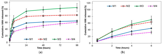 In vitro release profiles of VAN-loaded PLGA microparticles: (a) 96 h release; (b) initial release up to 6 h (mean ± SE, n = 3).