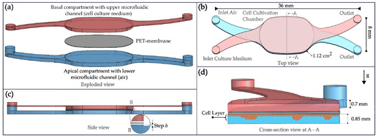 In the apical compartment, the inlet and outlet channels were made shallower than the cell cultivation chamber (see Figure 1c) to create a homogenous tangential airflow above the cell layer. The influence of the step height h was investigated by FEM simulations. As illustrated in Figure 1d, during dynamic cultivation, the cells could be cultivated upside down in the apical compartment and continuously supplied with cell culture media through the porous membrane above.