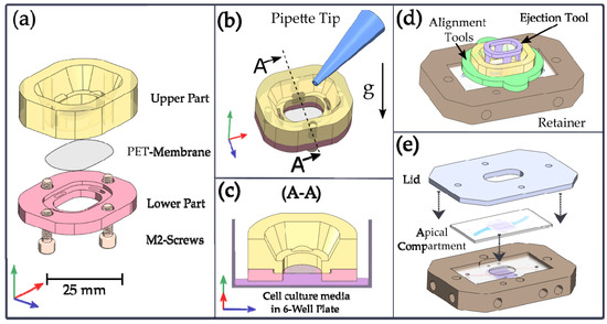 As shown in Figure 3a, a transfer holder was designed consisting of an upper and a lower part so that the nanoporous PET membrane could be clamped in between by four screws. Both parts were made of polyetheretherketone (PEEK) by precision CNC machining. The parts were coated with hydrophobic parylene C by CVD (SMÅLAND, NTTF coatings, Rheinbreitbach, Germany) to avoid the growing of cells when cells were injected through a pipette as illustrated in Figure 3b. The cavity that forms underneath the membrane can be carefully filled with cell culture media, which is kept in place by capillary forces, as depicted in Figure 3c, allowing a media level that is slightly higher than in the surrounding volume of a six-well plate, thereby avoiding static pressure on the cells through the membrane. An ejection tool for the release of the membrane and an alignment tool to replace the lower part of the transfer holder after static cell cultivation were realized by 3D printing (AR-M2 material, AGILISTA-3200W, Keyence Germany, Neu-Isenburg, Germany). These parts allowed for the alignment of the membrane on the chip’s apical compartment, covered with the contoured silicone layer which was already placed in the chip mount, as depicted in Figure 3d. The chip mount could be closed with a metal lid and four M4 metal screws with compression springs underneath (Febrotec Federn, Halver, Germany) after the membrane had been transferred and the basal chip compartment had been added, as depicted in Figure 3e. Besides the ejection and alignment tools, which can be sterilized in a 70% (v/v) ethanol in DI-water, all other parts can be autoclaved. The transfer procedure was also recorded and can be found in the Supplementary Material.