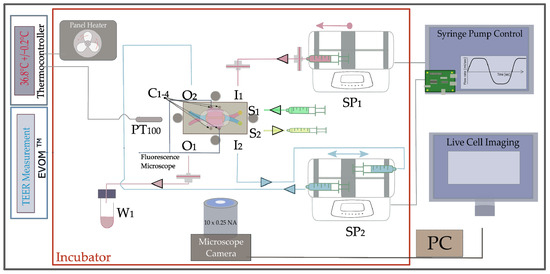 The experimental setup, as illustrated in Figure 4, consisted of the microfluidic mounting bracket containing the NM-chip, two syringe pumps SP1 (KDS series 200, KD Scientific, Holliston, MA, USA) and SP2 (KDS series 260, KD Scientific) and an inverted microscope (Primovert, Zeiss, Oberkochen, Germany). With the exception of the electronic control and evaluation units, all components were placed in a self-built incubator made of PMMA (polymethylmethacrylat) in which a temperature of 36.8 ± 0.2 °C was stabilized by a panel heater (SH130, Elmeko, Liebenscheid, Germany) controlled by a thermo controller (Jumo di eco, Jumo & Co., Fulda, Germany) coupled to an integrated thermosensor PT100. The microscope was equipped with a 10× plan achromatic objective and a microscope camera (PowerPack ace 3.2MP, Basler, Ahrensburg, Germany), allowing continuous monitoring of the cell layer. The mounting bracket holding the microfluidic chip had two inlets (I1, I2) and two outlets (O1, O2) which led into the microchannel. Two additional side ports (S1, S2) at both inlets allowed first, evacuation of trapped air in the tubings while filling the chip with cell culture medium, and second, the introduction of donor fluid (into the apical compartment) and the drawing out of acceptor fluid (from the basal compartment) volumes during permeation experiments. Syringe pumps were connected via PTFE tubes (ID = 0.750 mm, Techlab, Braunschweig, Germany) using flangeless fittings made of Delrin (H&S P-307, IDEX, Lake Forest, IL, USA). To avoid contamination inside the chip, the tubing for the cell culture medium was interrupted by hydrophilic sterile syringe filters (PTFE, 0.2 µm, Whatman, Maidstone, UK). Cell culture medium was supplied by syringe pump SP1 equipped with a 5 mL plastic syringe connected to I1 and was collected after having passed the chip through O1 in the waste reservoir W1. Syringe pump SP2 held two opposing 100 mL plastic syringes filled with sterile air to generate the periodic bidirectional airflow through the apical chip compartment via I2 and O2. The simultaneous push and pull by SP2 avoided unfavorable pressures acting on the cells. SP2 was controlled by a microprocessor (Raspberry Pi 4, Raspberry Foundation, Cambridge, UK) coupled to a touch display (7 inch IPS display, Jun-Saxifragelec, purchased via Amazon Germany, Munich, Germany). For the experiments, breathing cycles with a flow rate of 110 mL/s for 3 s inhalation and 3 s exhalation, with a 3 s pause in between, were programmed. Respiratory phases of 132 s alternated with rest phases of the same duration. Prior to the experiments, an EVOM2 ® resistance meter (World Precision Instruments, Sarasota, FL, USA) was connected to the ports C1–C4 using contact pins. To determine the TEER values, both chip compartments were filled with cell culture medium. Afterwards, the cell culture medium was carefully removed from the apical compartment.
