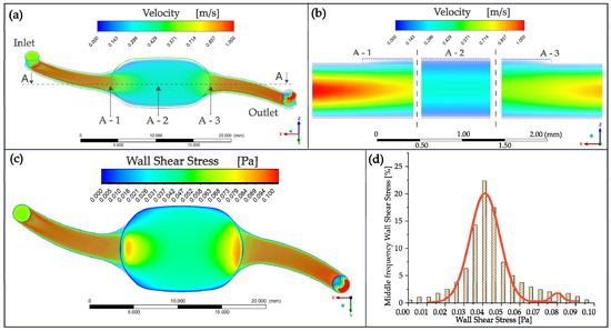 Simulation of the airflow inside the NM-chip at 110 mL/min. (a) Velocity profile at medium channel height with the airflow direction from left to right at a slightly tilted view. (b) Airflow velocity cross-sectional profiles at the inflow (A-1), in the center (A-2) and at the outflow of the chamber (A-3). (c) Airflow distribution of resulting WSS (top view) at the bottom of the cell cultivation chamber. (d) Histogram showing the distribution of the WSS (and indication of underlying Gaussian distributions) in the cell cultivation chamber during inhalation.