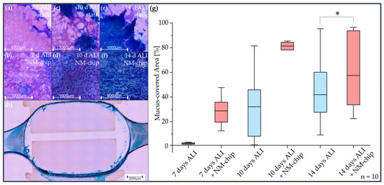 Confocal microscopy bright field images of alcian blue staining of mucus, performed at time stages 7 (a,b), 10 (c,d) and 14 (e,f) days of static cultivation at ALI in the transfer holder with membrane, and for each case after subsequent dynamic cultivation with periodic airflow for 3 h in the NM-chip. (g) The area fraction covered with mucus was obtained by image analysis for the same cultivation conditions (n = 10). The center lines in the box plots represent the median, the outer box edges show the 25% and 75% percentiles, and the whiskers show the outliers. The larger variations after 14 days result from small uncovered islands (* indicates p < 0.05). (h) NM-chip apical compartment (after membrane removal) with mucus stained from cell culture after 7 days ALI with NM-chip cultivation.