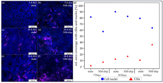 After 7 days, first small areas of cilia could be detected, as shown in Figure 7a. With subsequent on-chip cultivation, morphological changes towards a more spongy-like texture appeared, as shown in Figure 7b. Here, the ciliated cells were detected mostly around openings in the cell layer. After 10 days, the cell layer became more homogenous, as shown in Figure 7c. The area fraction with cell nuclei and for cilia increased, but with NM-chip dynamic cultivation, the area of stained cell nuclei reduced but the area for cilia increased, as shown in Figure 7d. After 14 days of static cultivation, the detected area fraction of ciliated epithelial cells did not change compared to the equivalent sample after 10 days, as shown in Figure 7e. However, Figure 7f shows that with NM-chip cultivation, larger continuous fields with cilia were found. Furthermore, the cell nuclei staining indicates areas of lower cell densities. As can be seen in the quantitative analysis given in Figure 7g, cell densities generally decreased after 10 days. With additional cultivation on the chip, the cell density decreased slightly in each case, but cilia formation could be still promoted.