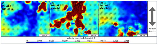 In Figure 8, the velocity vector fields obtained by PIV (the movies used are accessible in the Supplementary Material) tracked dead cells and round mucus fragments that moved over the cell layer. These are presented for the three cell differentiation stages in each case, which were followed by 3 h of on-chip dynamic cultivation. After 7 days of ALI cultivation, the vector field, as shown in Figure 8a, indicates velocity magnitudes up to 0.024 mm/min, whereby a uniform direction was found in only a small part of the area. After 10 days, the cilia became more agile, leading to a higher areal fraction exceeding velocities of 0.024 mm/min, as shown in Figure 8b. The direction of ciliary transport predominantly corresponds to the direction of airflow, with the exception of a local vortex that was formed in the center.