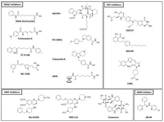 Structures of the different compounds tested in this study (HDACs: histone deacetylases; HMTs: histone methyltransferases; DNMTs: DNA methyltransferases; HATs: histone acetyltransferases; HDMs: histone demethylases, BRD4: bromodomain-containing protein 4).