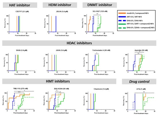 The 10 compounds with IC50 values below or equal to the 1 µM threshold were tested in the QSA [28] to determine their activity against ART-resistant parasites maintained in a quiescent state during a 48-h exposure. Compounds were tested at their IC90 values of the concentration at which apicidin in a previous study showed a significant effect on epigenetic marks and gene expression [59]. Despite the potential risk of off-target activity, we used IC90 values for all epidrugs tested in the QSA to have comparable experimental conditions. As a reminder, activity against quiescent parasites is evidenced in the QSA by a significant delay in recrudescence time between the conditions “ART/ART” and “ART/ART + compound to be tested” (or “DHA/DHA” and “DHA/DHA + compound to be tested” when using DHA instead of ART to induce quiescence). The longer this delay, the more effective the compound is. However, to make sure this delay was meaningful and biologically relevant, we set a 6-day threshold to consider a compound to be active against quiescent parasites [28]. Atovaquone, used as a positive drug control in the QSA [28], showed delayed parasite recrudescence times ranging from 9 to 12 days.