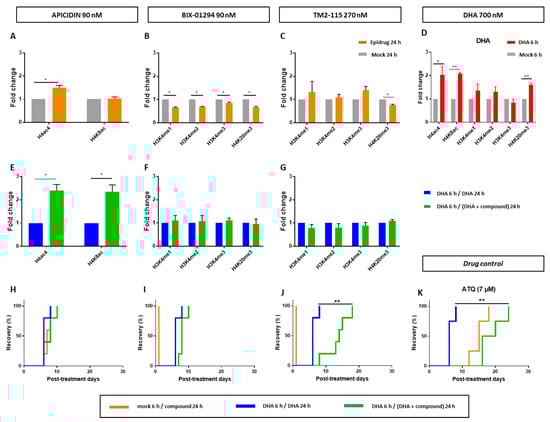 Firstly, as control conditions, histone methylation and acetylation were quantified in proliferating parasites after treatment with the epidrug or with DHA alone (Figure 3A–D).