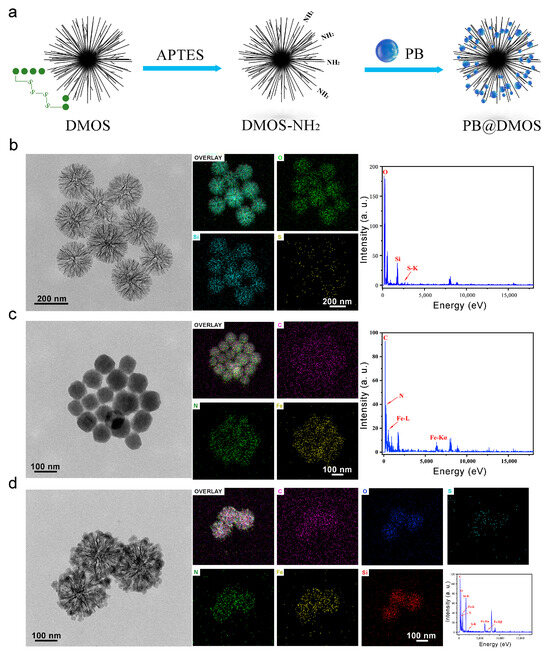 Morphology and structure. (a) Schematic illustration of PB@DMOS synthesis. (b) TEM image, elemental mapping images, and EDS spectra of DMOS. (c) TEM image, elemental mapping images, and EDS spectra of PB. (d) TEM image, elemental mapping images, and EDS spectra of PB@DMOS.