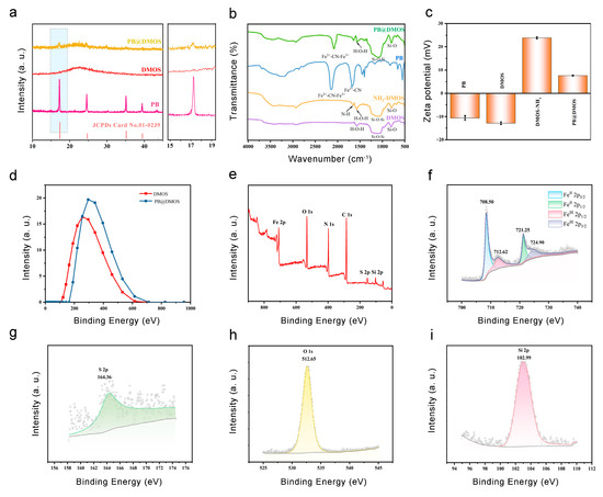 (a) XRD spectrum of PB, DMOS, and PB@DMOS. (b) FT-IR spectrum of DMOS, NH2-DMOS, and PB@DMOS. (c) Zeta potential of PB, DMOS, NH2-DMOS, and PB@DMOS. (d) DLS spectrum of DMOS and PB@DMOS. (e) Full XPS spectra of PB@DMOS. (f–i) High-resolution spectra of Fe, S, O, and Si elements, respectively.