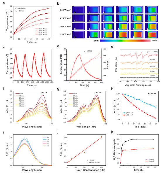 Photothermal properties, ROS generation, and GSH responsive H2S release. (a) The temperature increase in PB@DMOS under different power densities. (b) Infrared thermal images PB@DMOS under different power densities. (c) Recycling course of heating and cooling process for four cycles (140 μg/mL, 0.50 W/cm2). (d) Fitting linear relationship of -ln(θ)-t calculating from cooling data. (e) ESR spectra for detection of •OH via DMPO under different conditions. (f,g) UV-vis absorption spectra of MB catalyzed using PB@DMOS group under pH = 6.5 and 7.5. (h) The change absorbance with time at 664 nm for oxide MB catalyzed using PB@DMOS group under pH = 6.5 and 7.5. (i) UV-vis absorption spectra of GSH consumption using PB@DMOS. (j,k) H2S release properties of PB@DMOS.