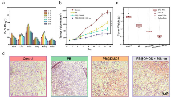 The biodistribution of PB@DMOS, the BALB/c mice were injected with 4T1 cells and then injected with PB@DMOS (20 mg/kg) for treatment. The Fe ions concentration in major organs (heart, liver, spleen, lung, and kidneys) and tumors were dissected using ICP-OES. the in vivo anticancer effect, the BALB/c mice injection with 4T1 cells randomly fell into four groups (n = 5). The group was set as follows: (1) control, (2) PB, (3) PB@DMOS, and (4) PB@DMOS+808 nm. The mice in the (2)–(4) group were injected intravenously with various samples PB, PB@DMOS, and PB@DMOS, respectively, (20 mg/kg, 0.1 mL). The 808 nm laser irradiation time was 10 min. The tumor volumes and weights of the mice were measured once every two days. After the therapeutic process, the main organs and tumors were collected from groups, where the H&E staining assays were presented to confirm the injury caused by PB@DMOS.
