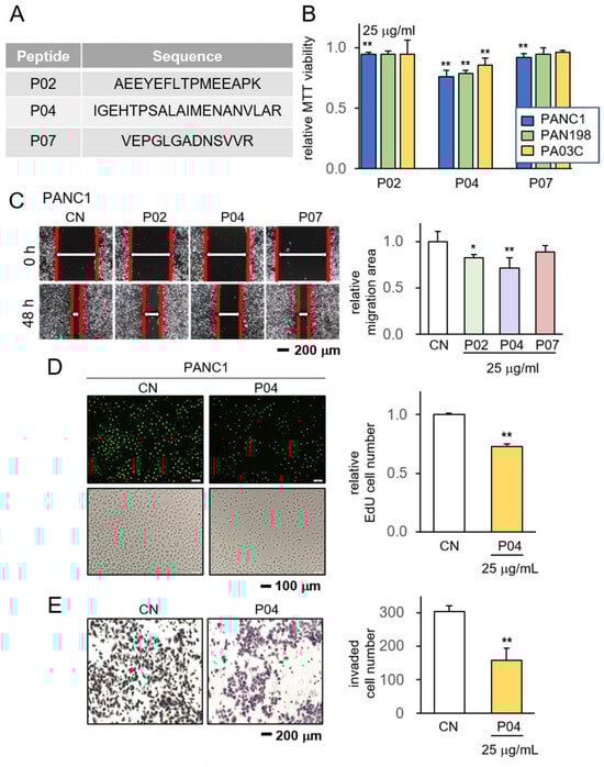 Anti-tumor effect of P04 on PDAC cell lines. CN = control. The single and double asterisks indicate p < 0.05 and 0.01, respectively. (A) The amino acid sequences of the selected three peptides, including P02, P04, and P07; (B) reduction in MTT-based viability of PANC1, PAN198, and PA03C pancreatic tumor cells in response to 25 μg/mL of P02, P04, and P07; (C) reduction in scratch-based motility of PANC1 cells in response to 25 μg/mL of P04; (D,E) suppression of EdU-based proliferation and transwell-based invasion of PANC1 cells in response to 25 μg of P04, respectively.