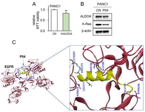Predicted interaction between P04 and EGFR. The double asterisk indicates p < 0.01 vs. CN (A) Reduction in MTT-based viability of PANC1 cells in response to 5 μg/mL of recombinant ALDOA protein; (B) decrease in the levels of ALDOA and K-Ras in PANC1 cells by the application of 25 μg/mL of P04; (C) predicted interactions between P04 and EGFR by molecular docking using Z-DOCK software 2016.